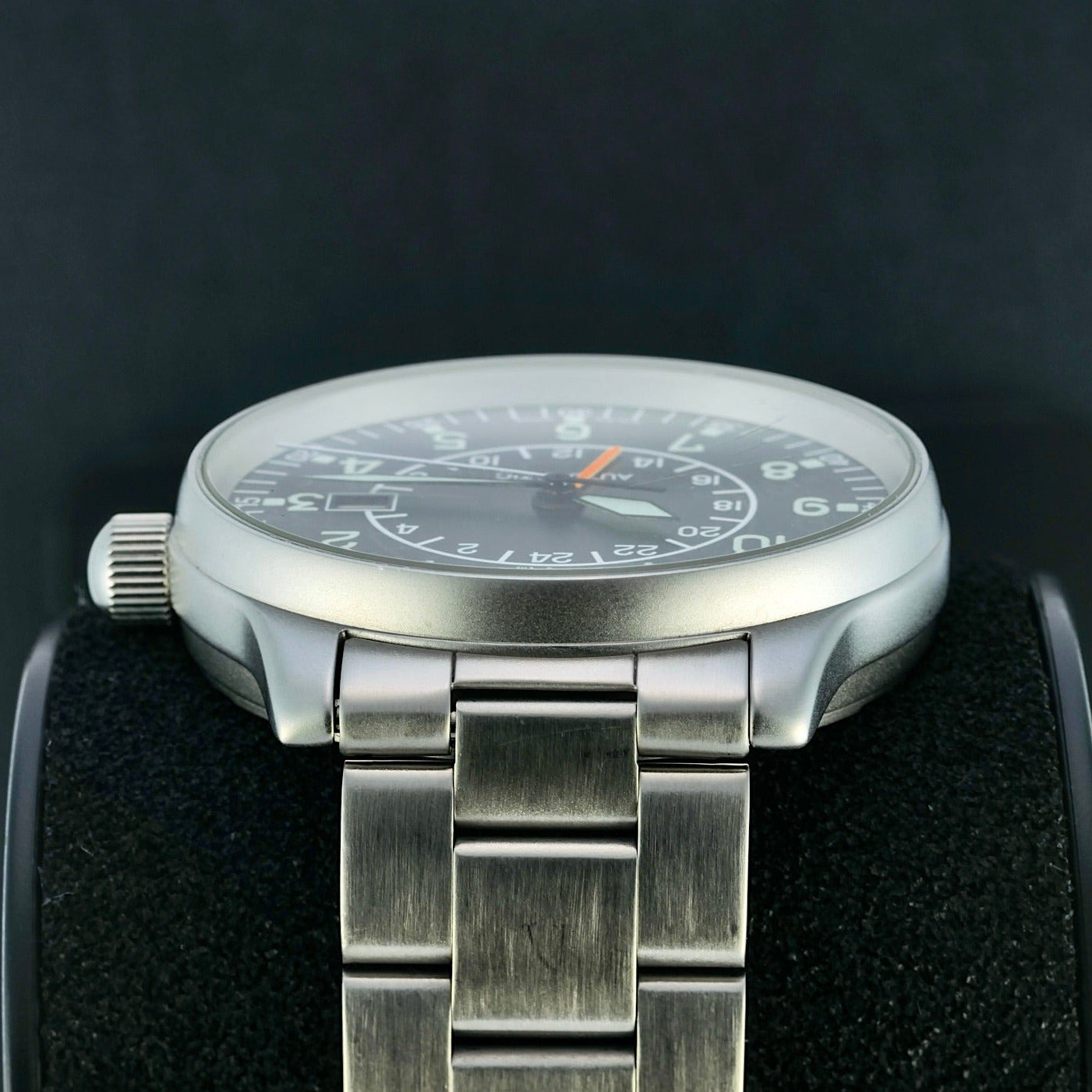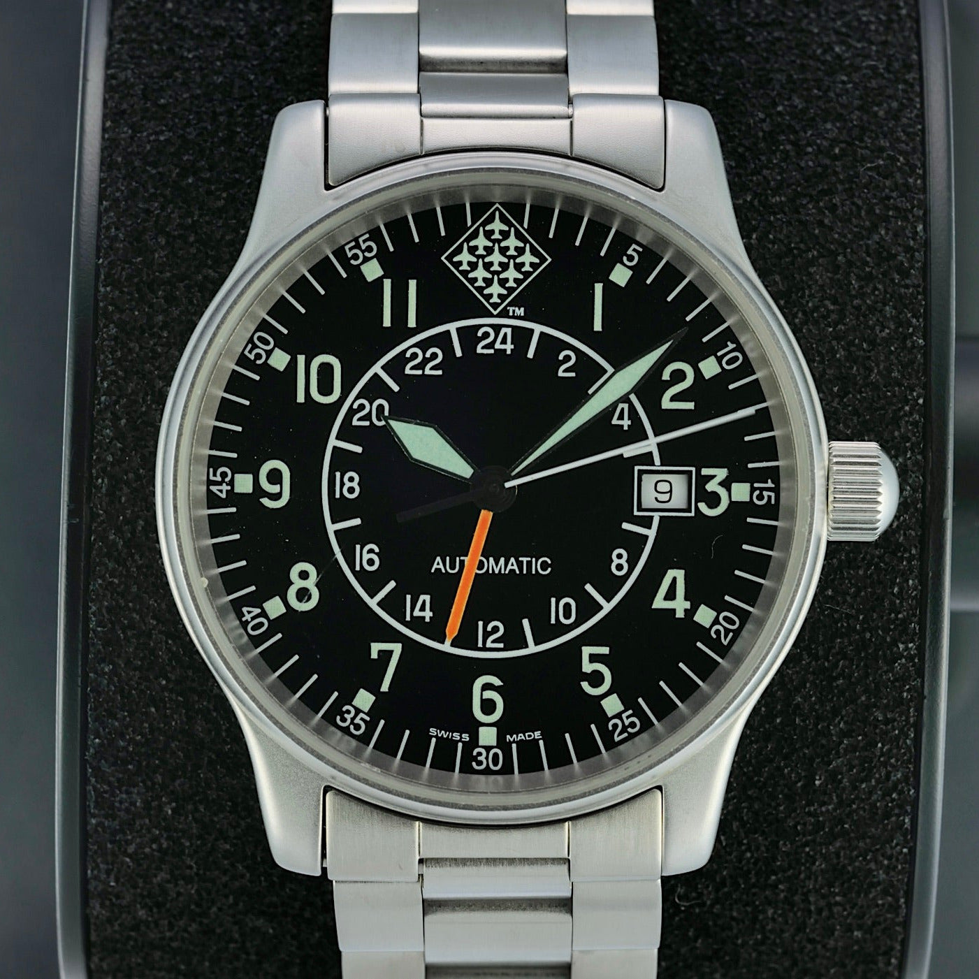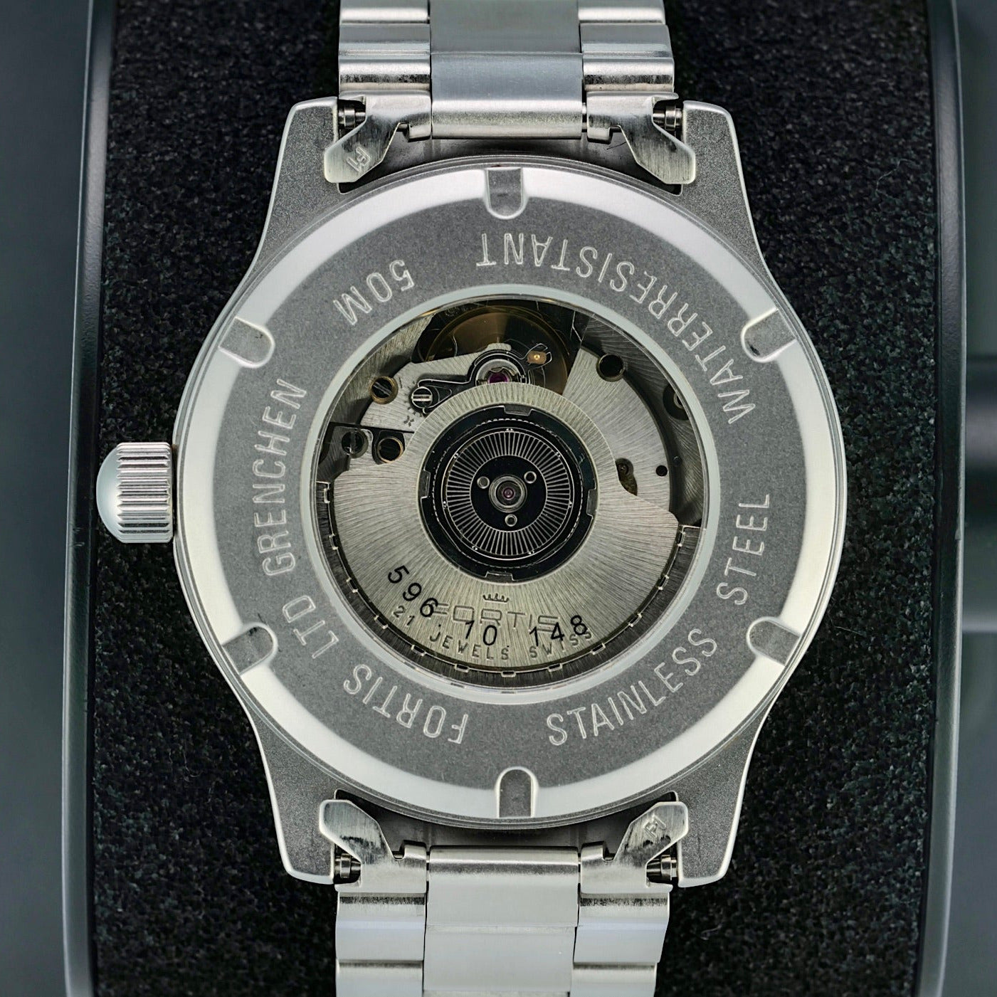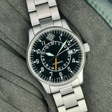 The Fortis “Red Arrows” Automatic GMT 596.10.148 is a neo-vintage pilot’s watch that blends classic aviator heritage with practical world-time functionality. Produced in the mid-1990s as a special edition commemorating the British Royal Air Force’s famed aerobatic team, the Red Arrows, this model features a robust 40 mm stainless-steel case, a black dial with bold Arabic numerals for exceptional readability, and an automatic ETA 2893-2 movement with a GMT complication that lets wearers track a second time zone—an essential feature for pilots and frequent travelers alike.