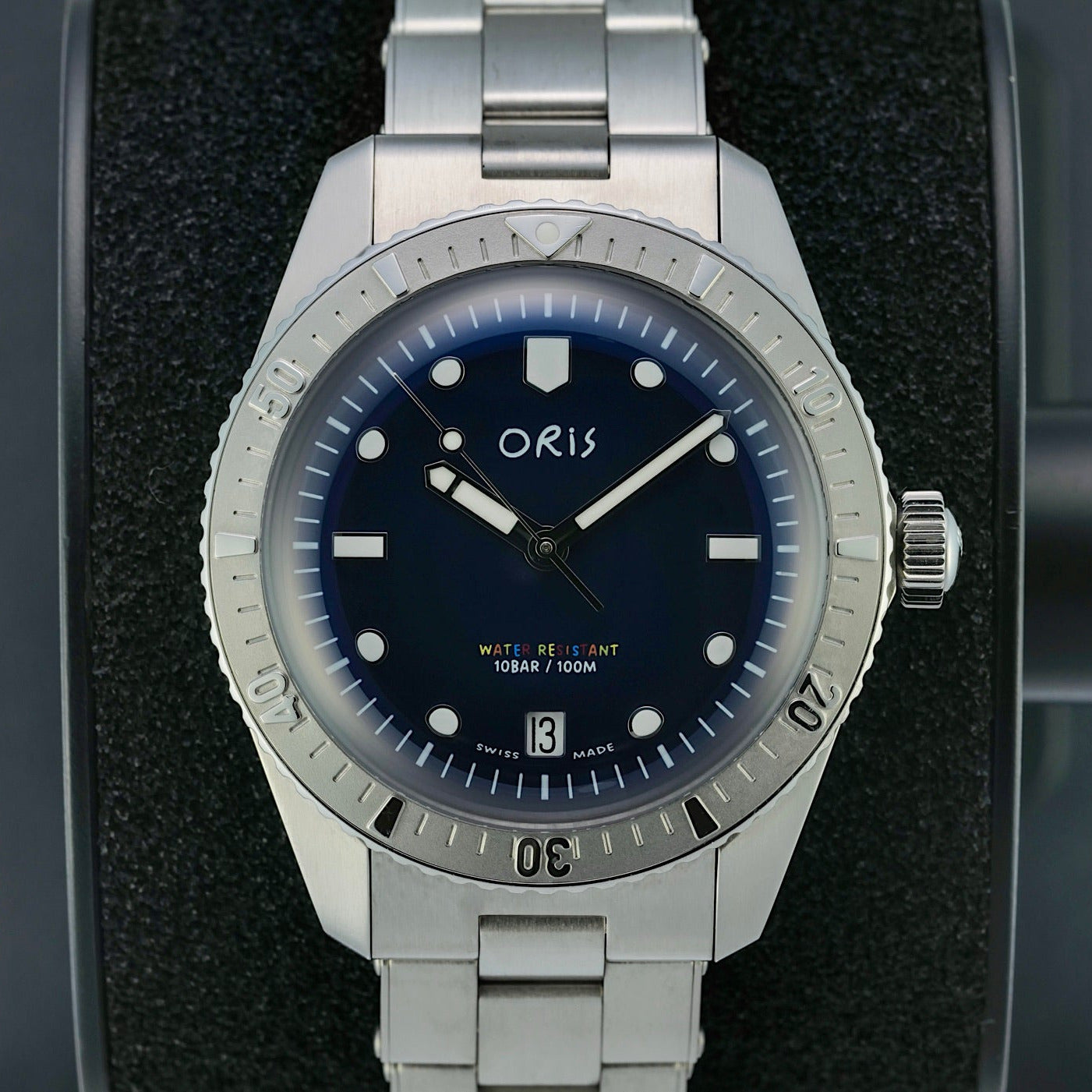 The Oris Divers Sixty‑Five LFP Limited Edition Ref. 0173377714085 is a distinctive limited-edition timepiece filled with vintage dive-watch charm. Part of the celebrated Divers Sixty-Five family, this 38 mm stainless-steel automatic was produced in a limited edition run of just 1,000 pieces. The LFP edition was created in partnership with the French Ligue de Football Professionnel in celebration of the support of its charity football tournament, Les Défenseurs de l’Enfance.