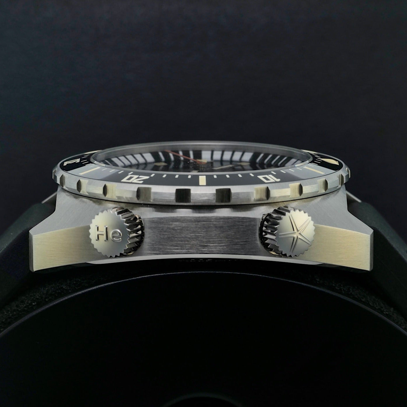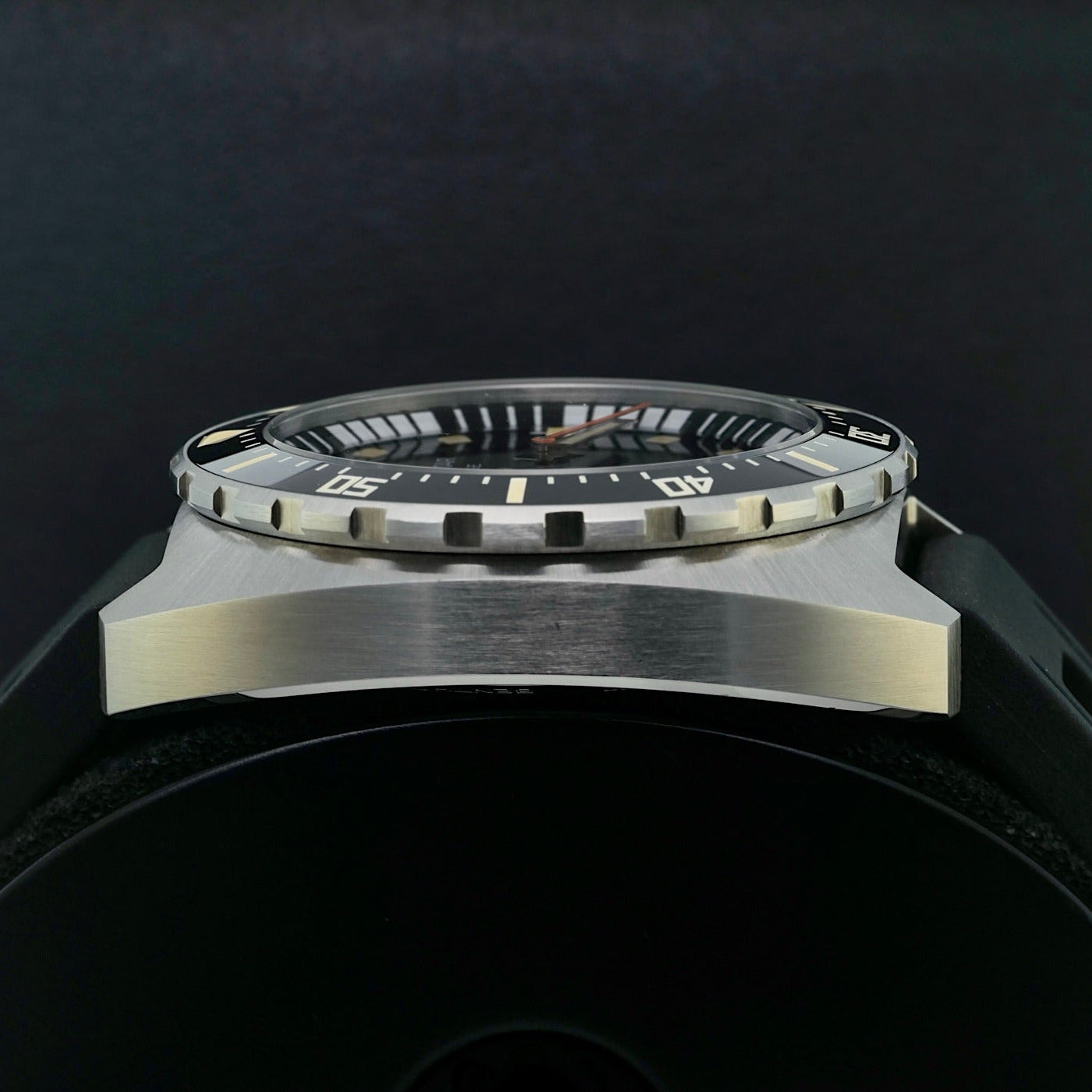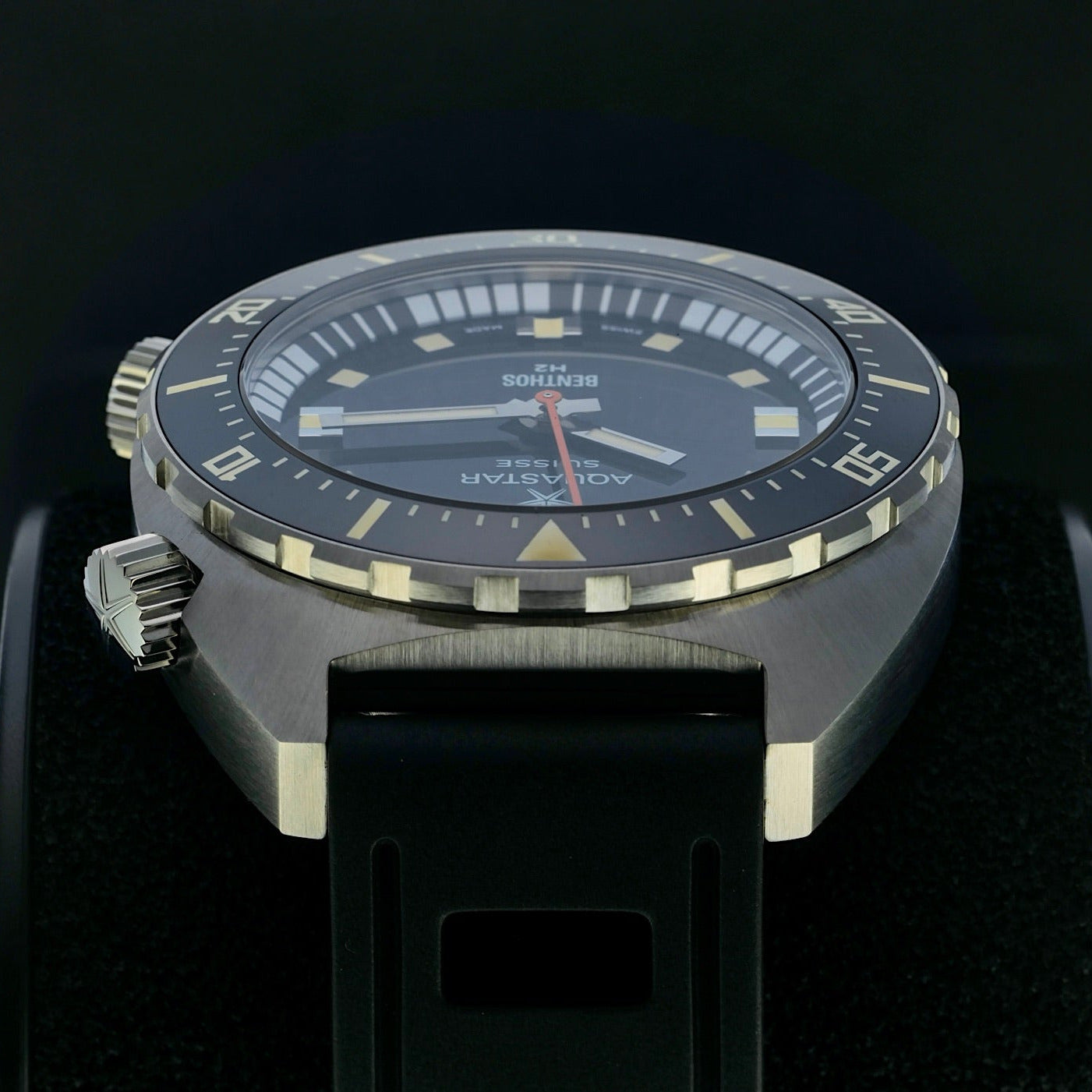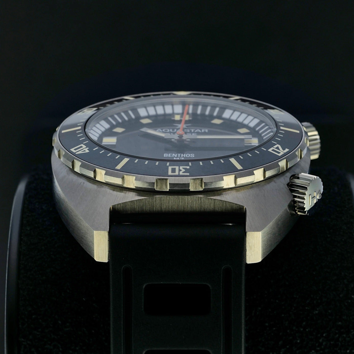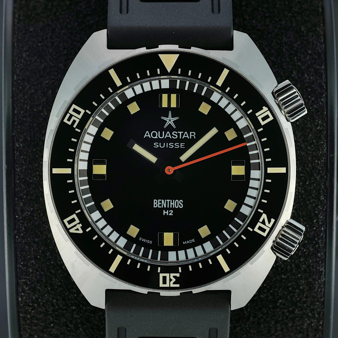The Aquastar Benthos Heritage II revives one of the most distinctive professional dive watches of the 1970s, blending vintage character with modern engineering. Staying true to the original Benthos worn by saturation divers, it features the signature asymmetrical stainless-steel case with an integrated crown guard, engineered for serious underwater use. Limited to a production run of 500 pieces, the Benthos Heritage II is a faithful tribute to Aquastar’s deep-sea legacy, reimagined for today’s enthusiasts.