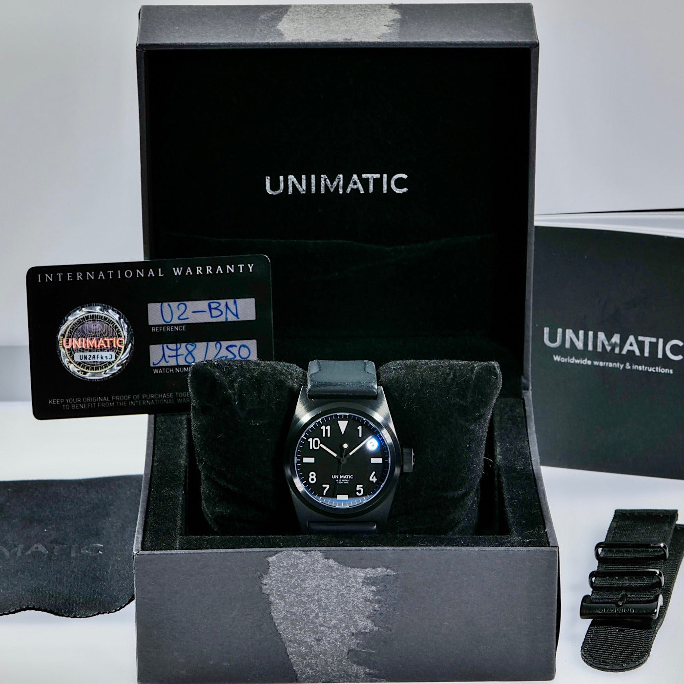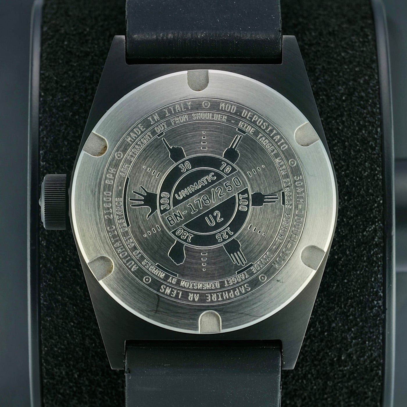 The Unimatic U2-BN Modello Due is a refined and rugged timepiece that blends minimalist Italian design with professional dive watch functionality. The U2-BN strikes a balance between vintage inspiration and contemporary craftsmanship. Built to withstand the demands of underwater exploration, the U2-Bn was built with a limited production run of only 250 numbered pieces and offers excellent legibility and a versatile aesthetic that transitions seamlessly from wetsuit to everyday wear.