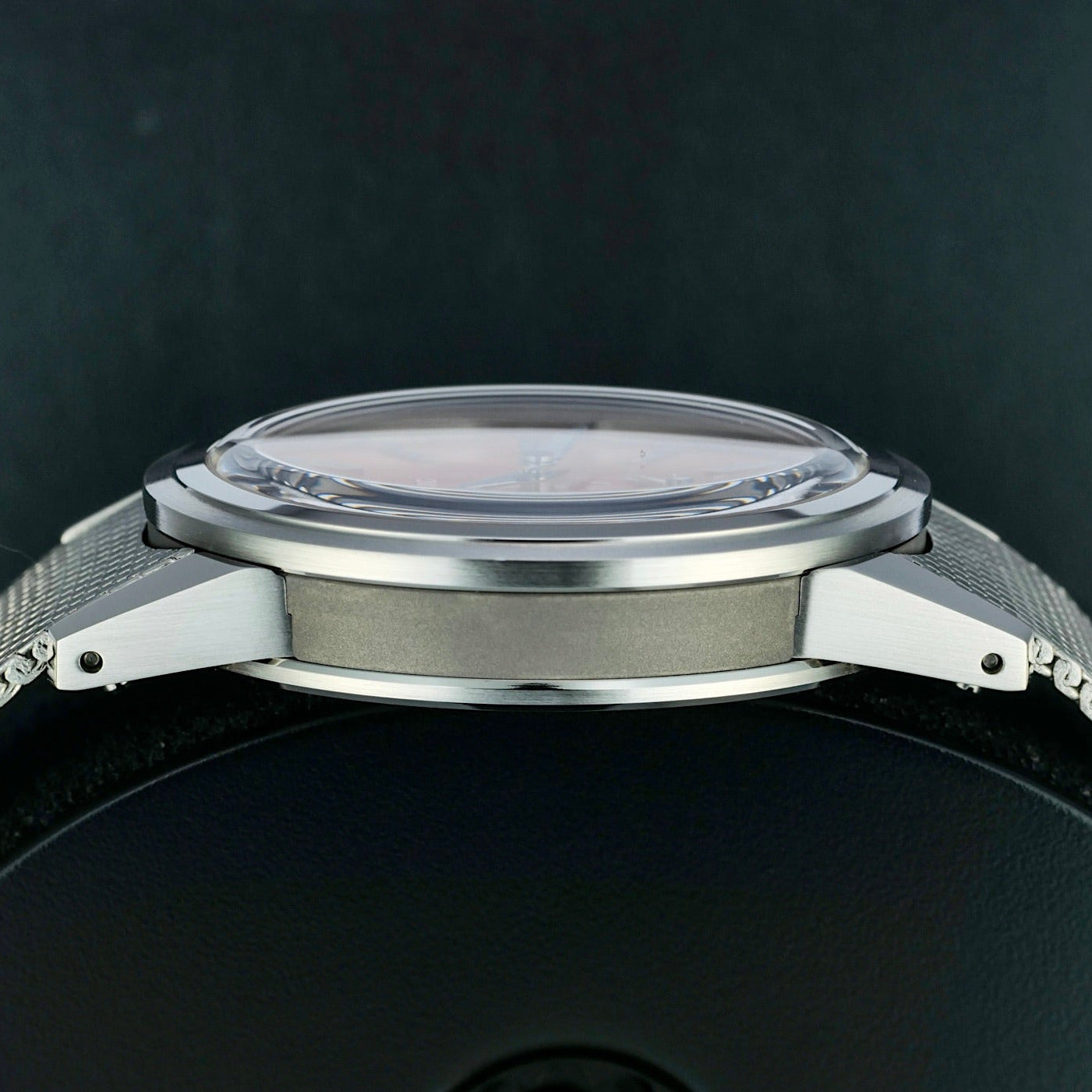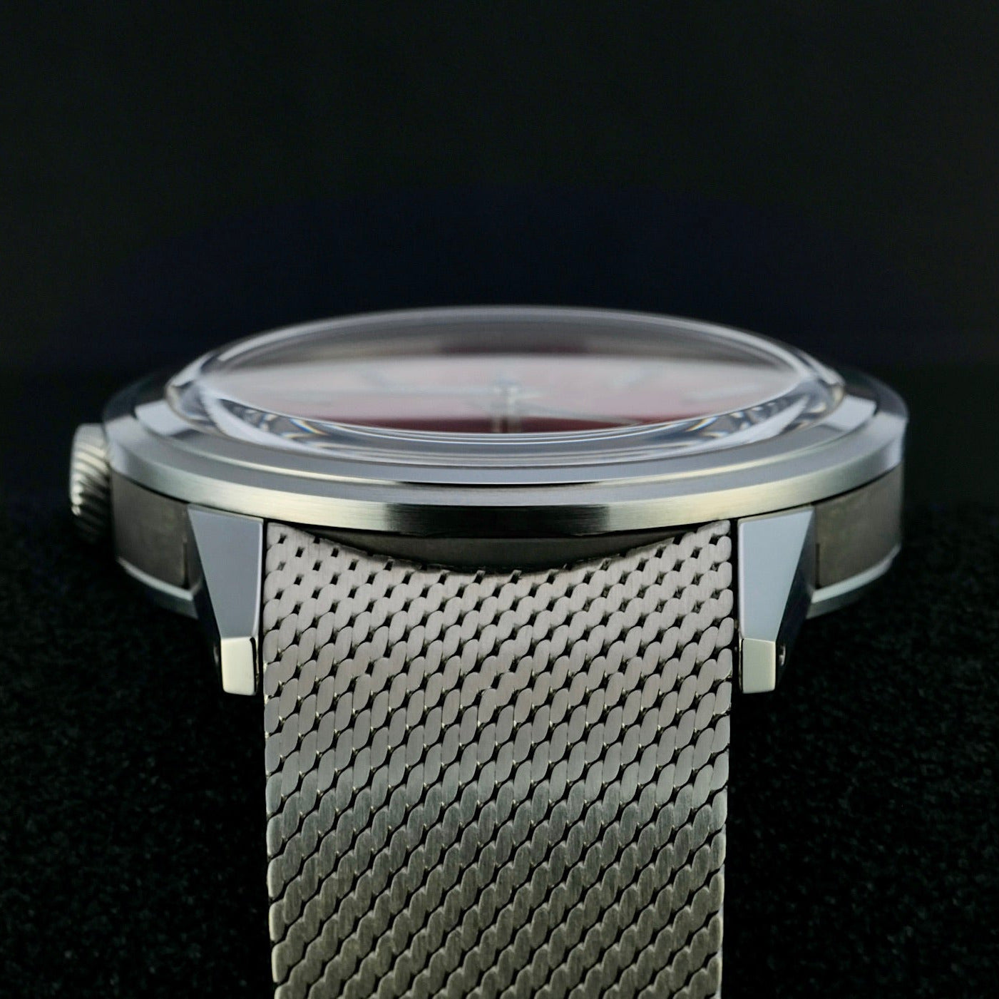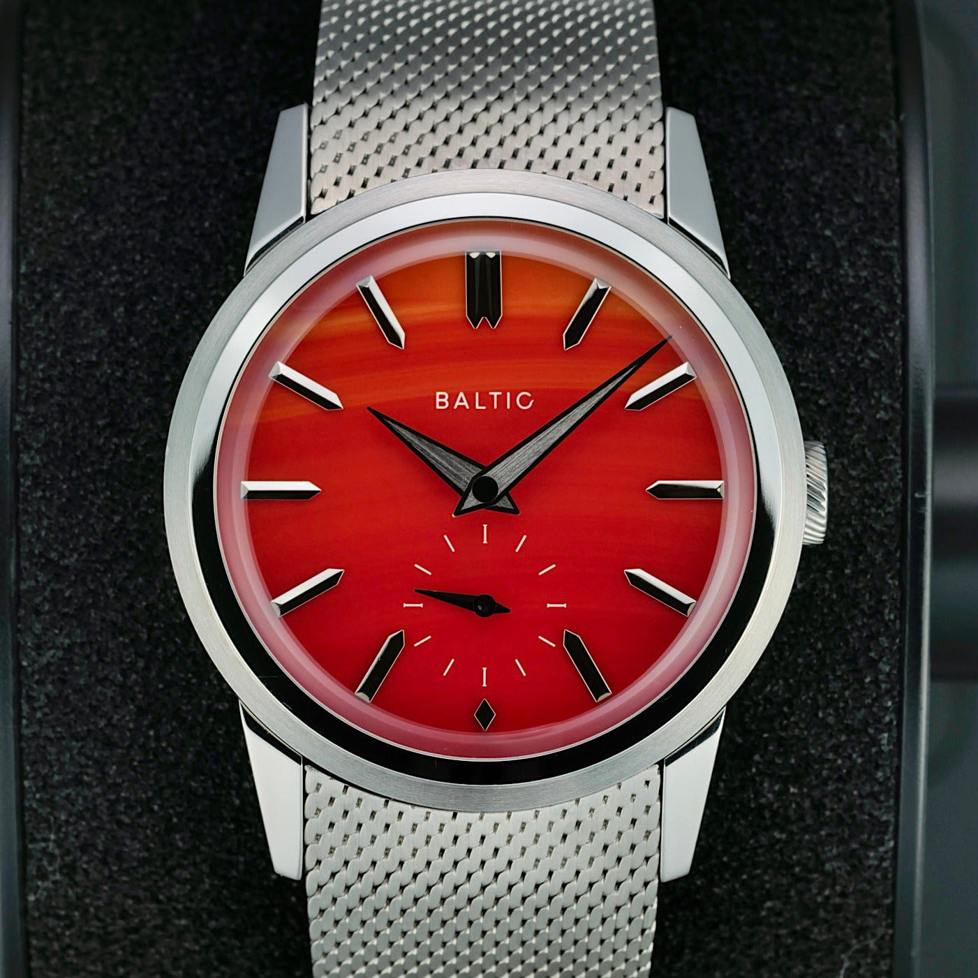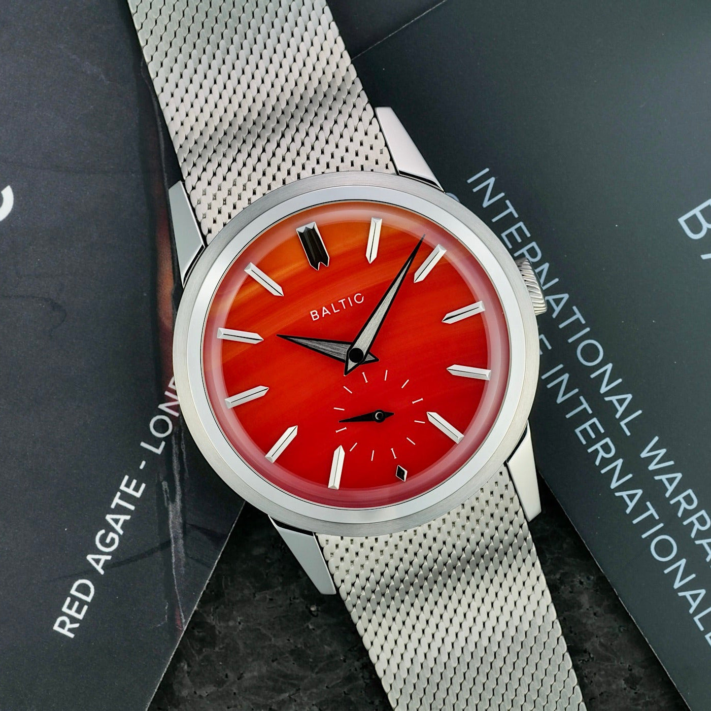 The Baltic Prismic Stone Red Agate London Edition is a sophisticated limited-edition dress watch that blends natural artistry with refined watchmaking. Its 36 mm case combines a stainless steel bezel and lugs with a Grade 5 titanium mid-case, resulting in an ultra-slim 9.2 mm profile that wears effortlessly on the wrist. At its heart lies a striking red agate dial—each one uniquely patterned by nature, ensuring every piece is one of a kind. Limited to just 200 pieces, this watch is as much a statement of individuality as it is of elegance, uniting vintage-inspired proportions with modern materials and craftsmanship.