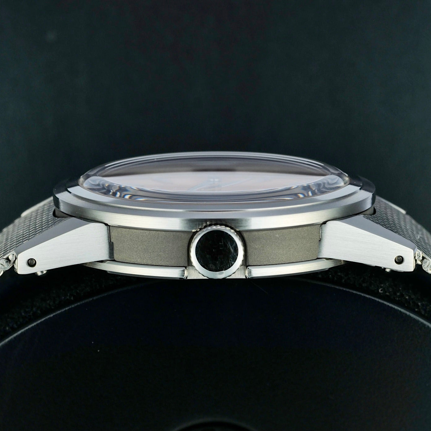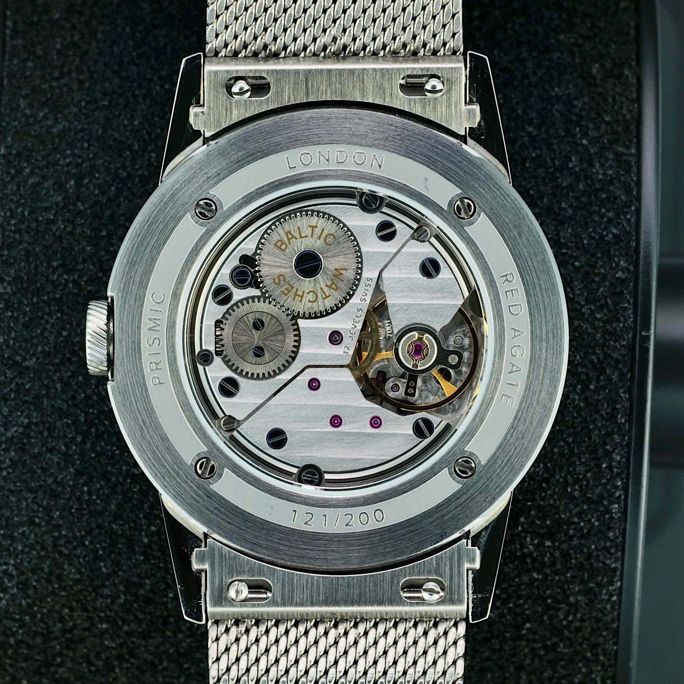 This Baltic Prismic Stone Red Agate London Edition is number 121/200 and includes the original outer box, inner box, warranty card, owner’s manual, and the original Baltic mesh steel bracelet.