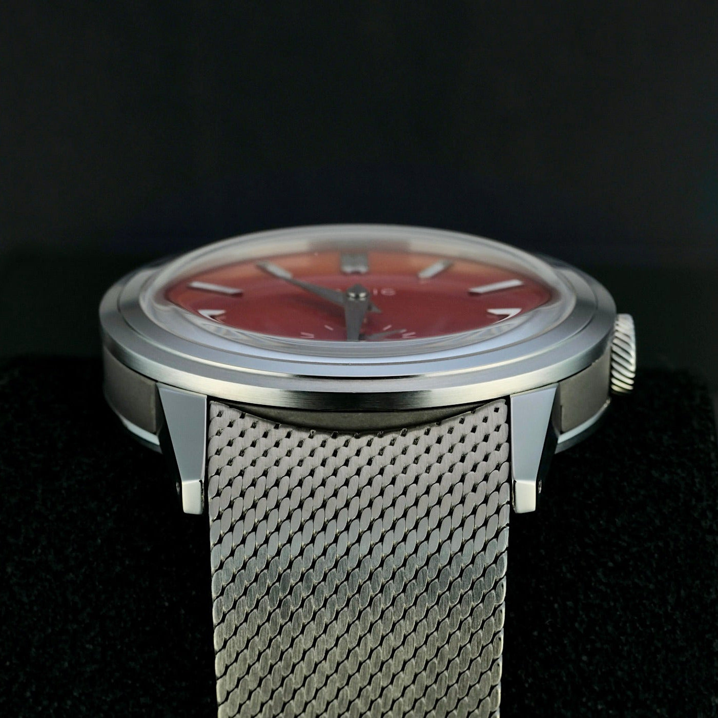 The Baltic Prismic Stone Red Agate-London Edition features a 36mm stainless steel and Grade 5 titanium case, paired with a domed sapphire crystal.  The striking red dial is made of Red Agate natural stone, with brushed dauphine hands with polished chamfers, polished and applied indexes, and a small seconds register at the 6 o’clock position. Powered by a manual wind ETA Peseux 7001 movement, the Prismic Stone features a 42-hour power reserve and a water resistance rating of 30 meters.