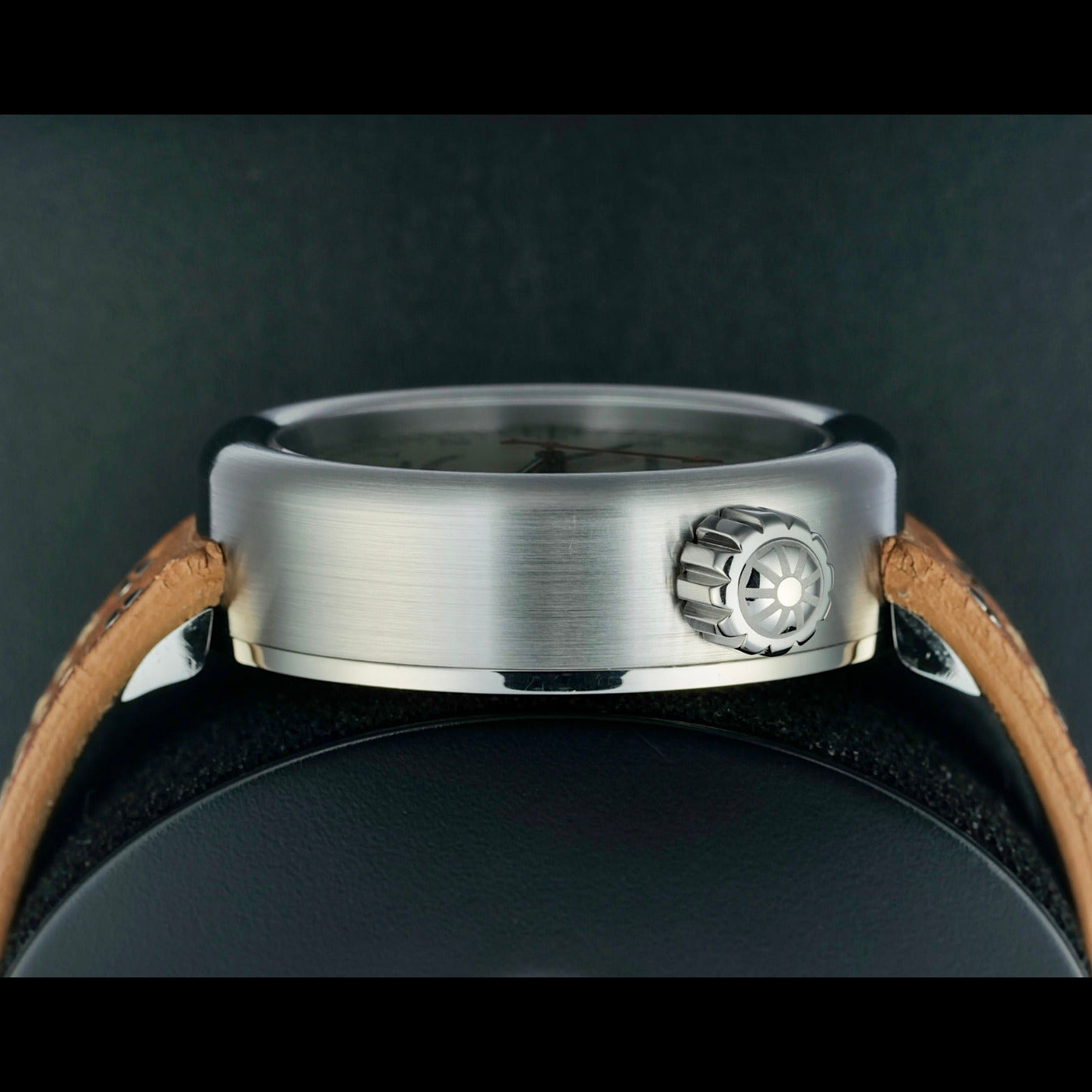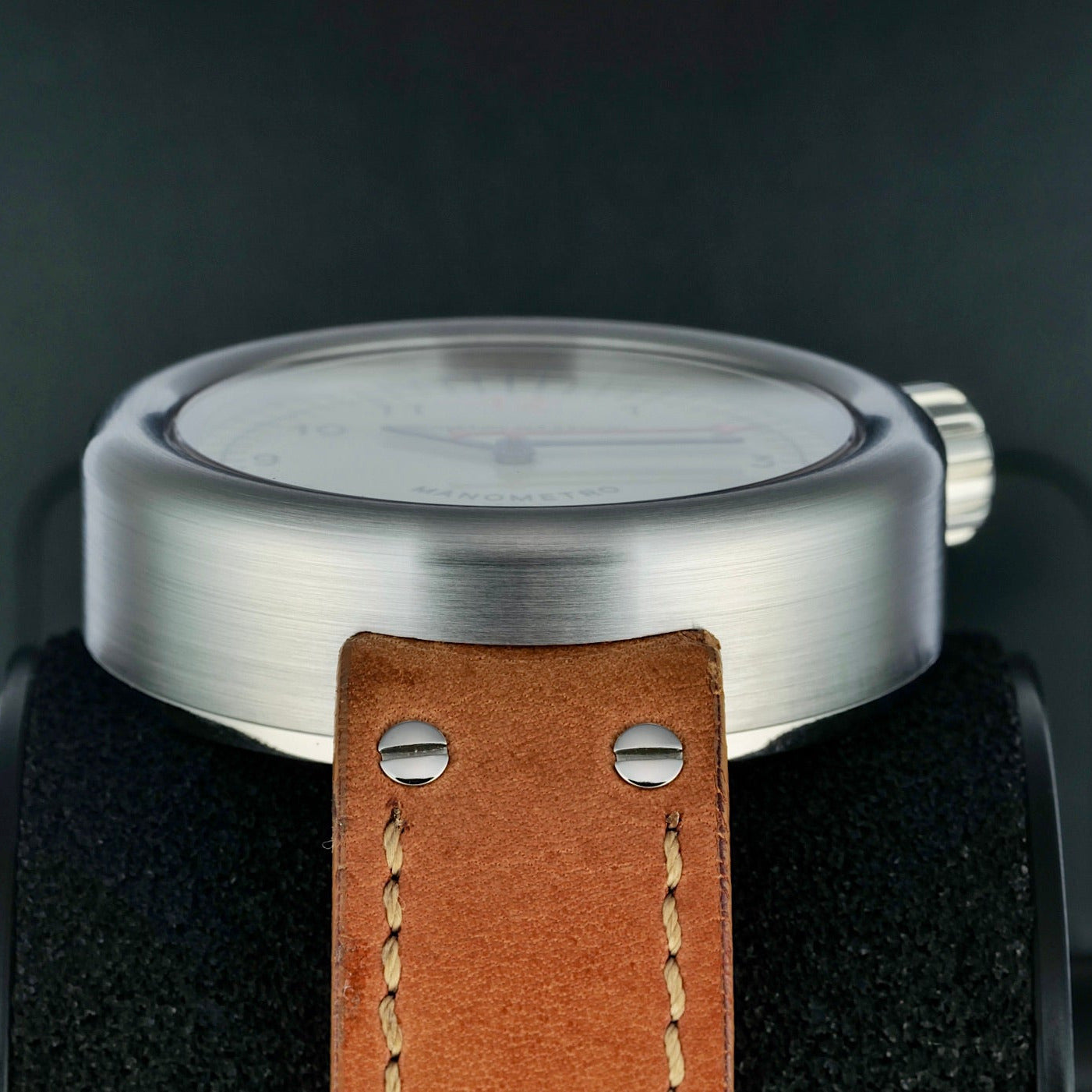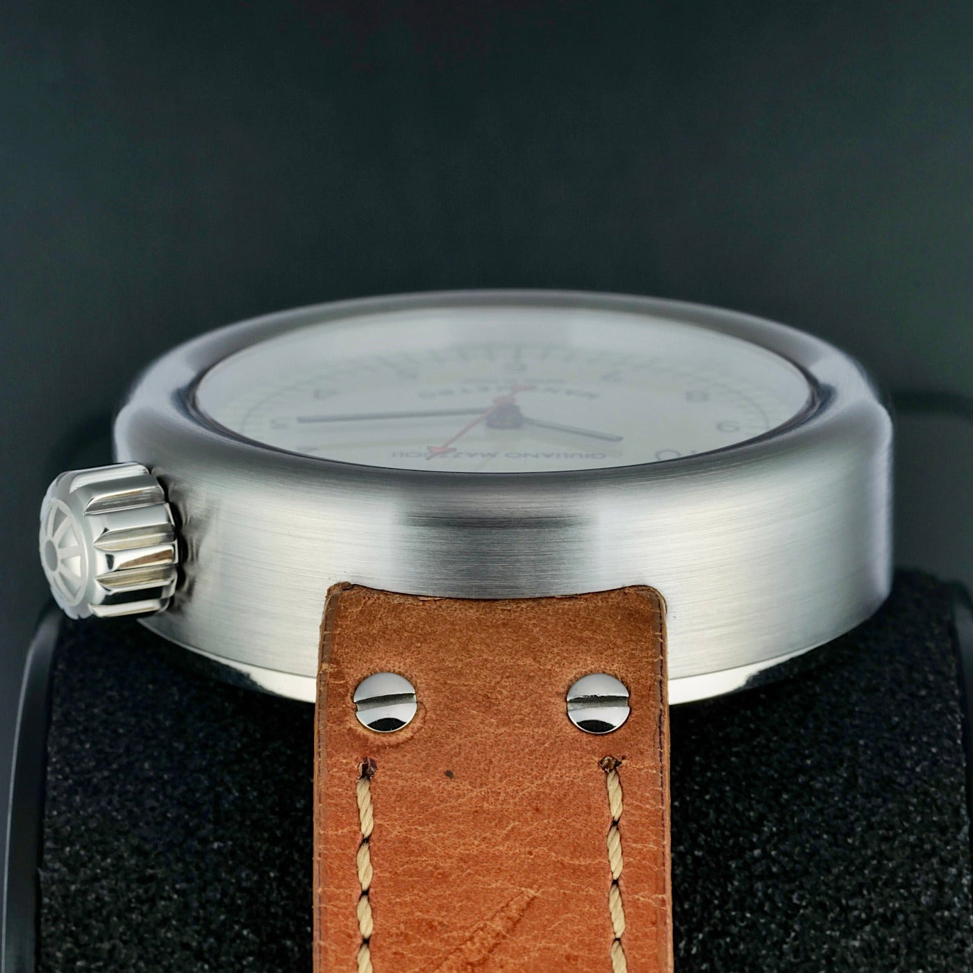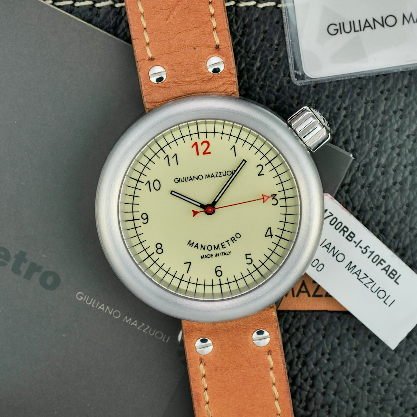 The Giuliano Mazzuoli Manometro is a distinctive Italian-designed wristwatch inspired by industrial pressure gauges — “manometro” means pressure gauge in Italian. Designed in Italy and crafted with Swiss precision, the watch’s minimalist yet bold aesthetic, combined with a handcrafted Tuscan leather strap and convex sapphire crystal, makes it a standout piece that blends mechanical charm with refined everyday wearability.