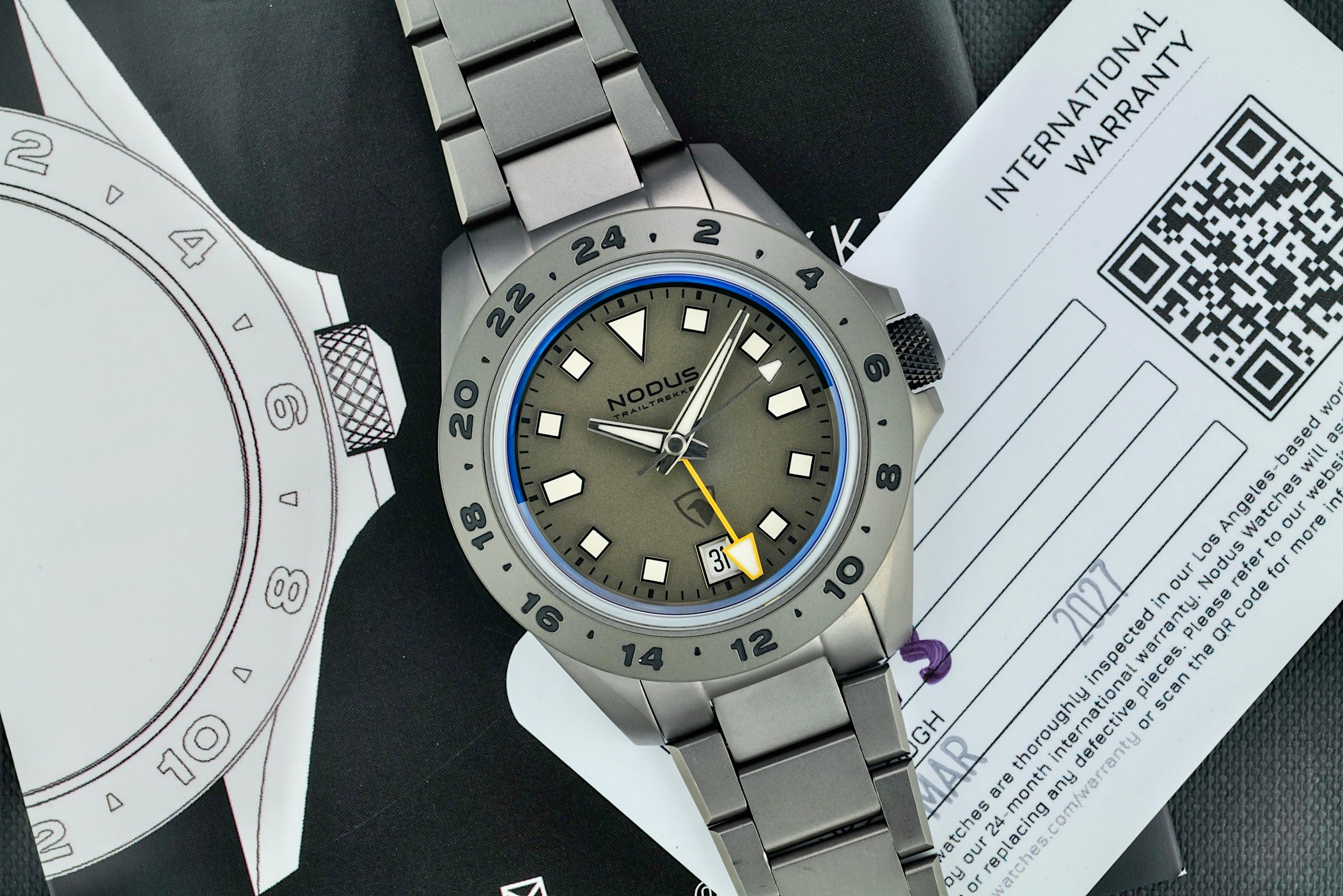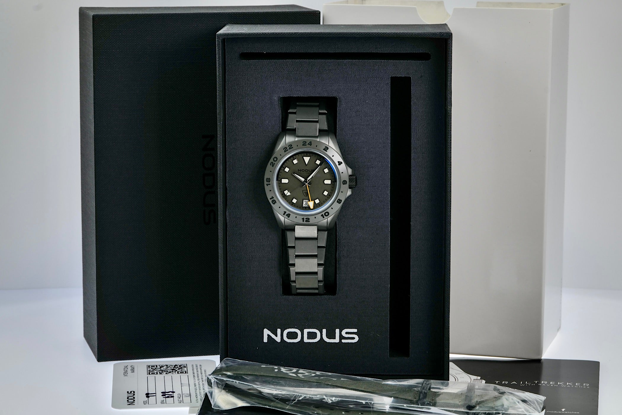card, a Nodus cleaning cloth, an additional Nodus NATO strap, and the original Nodus grey DLC-coated bracelet.