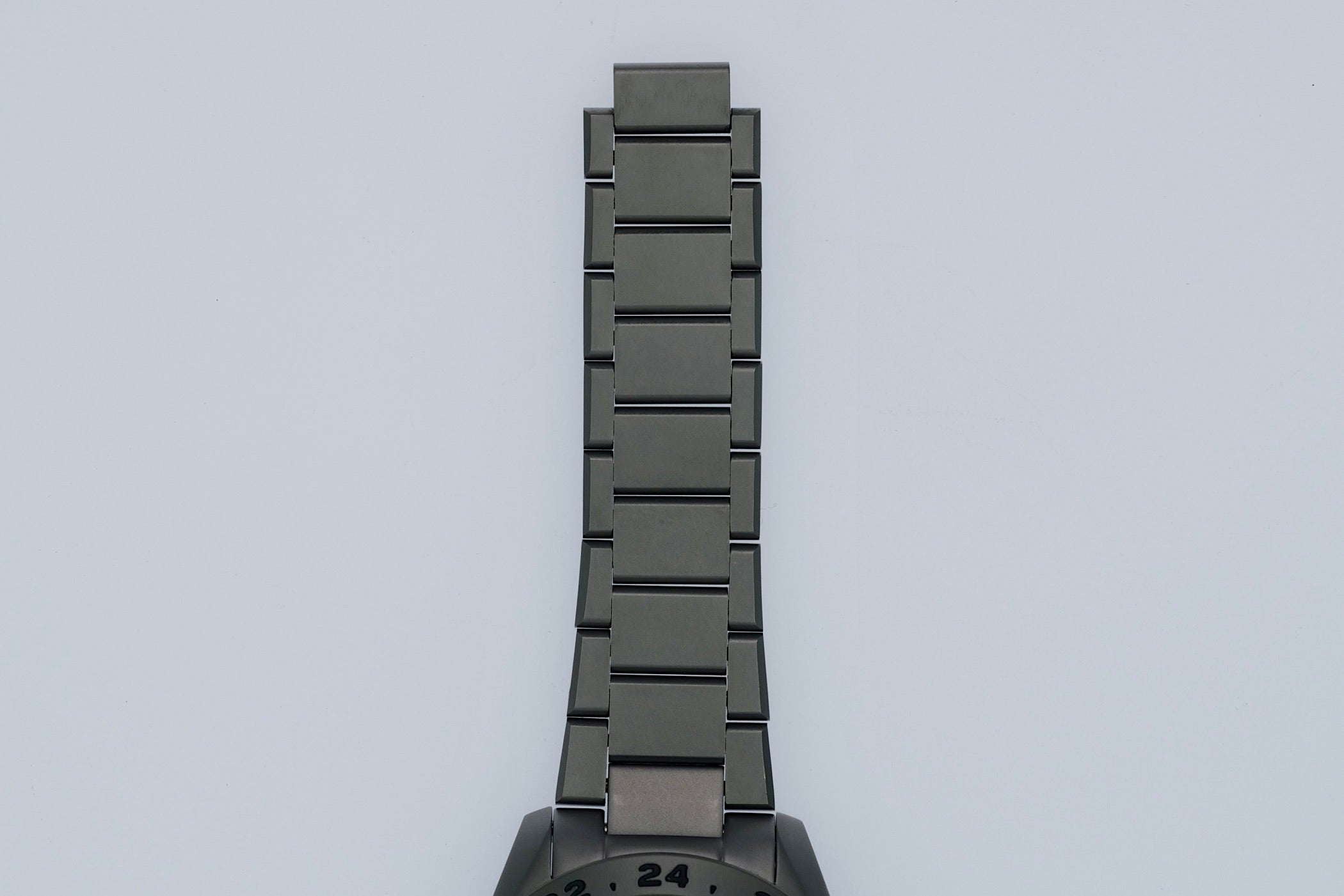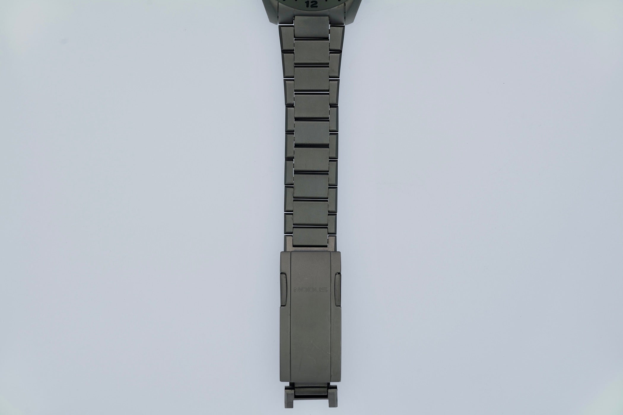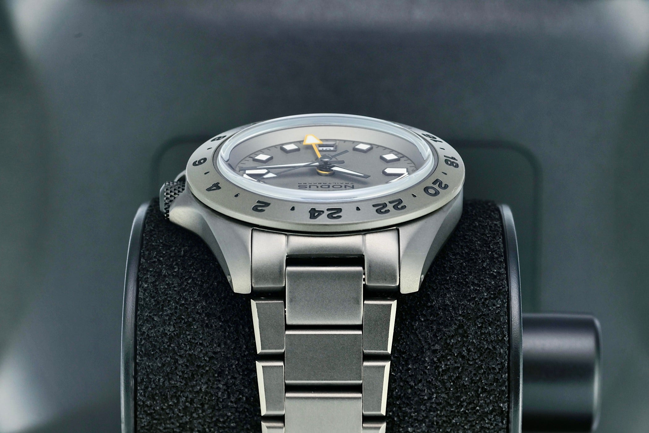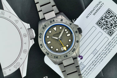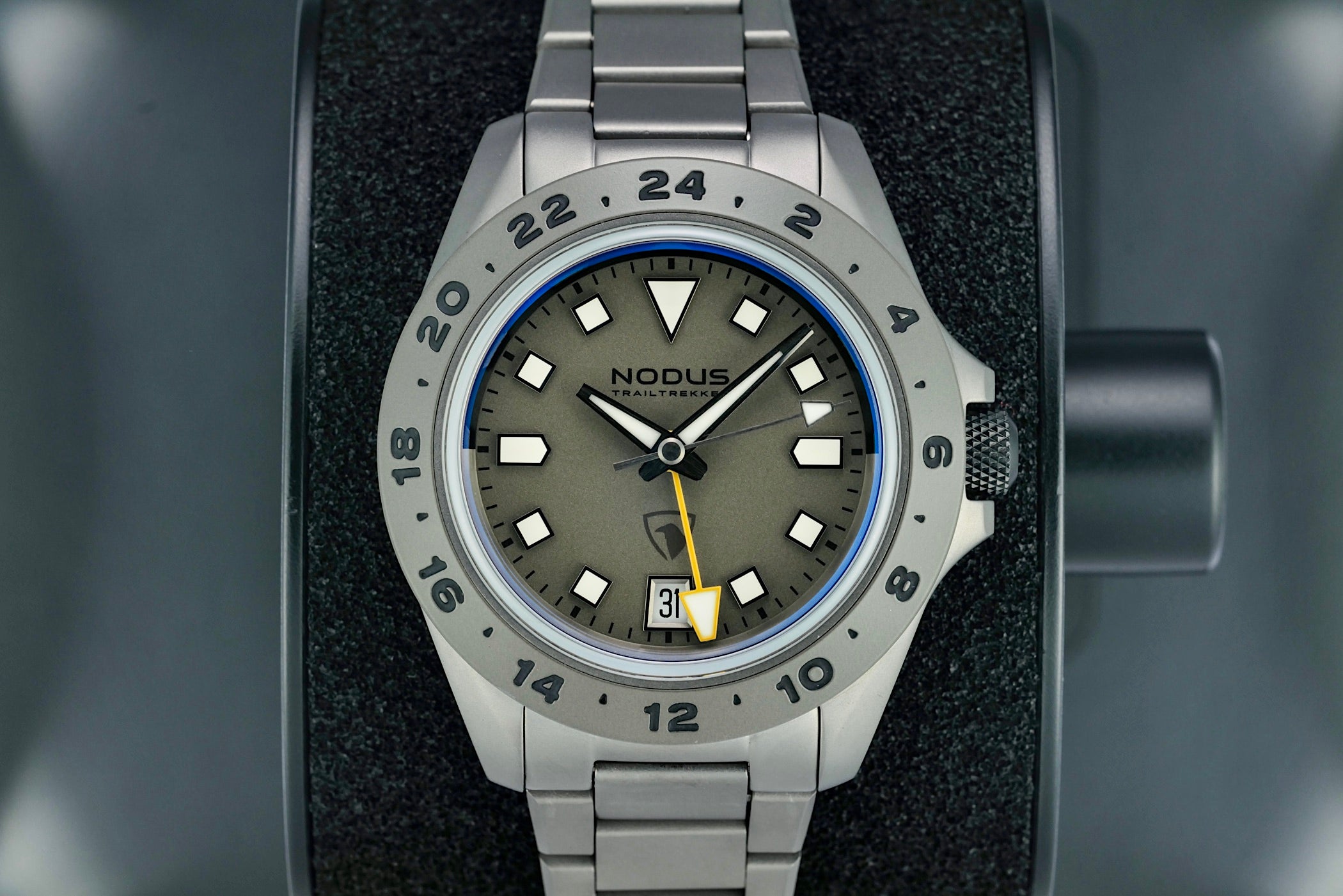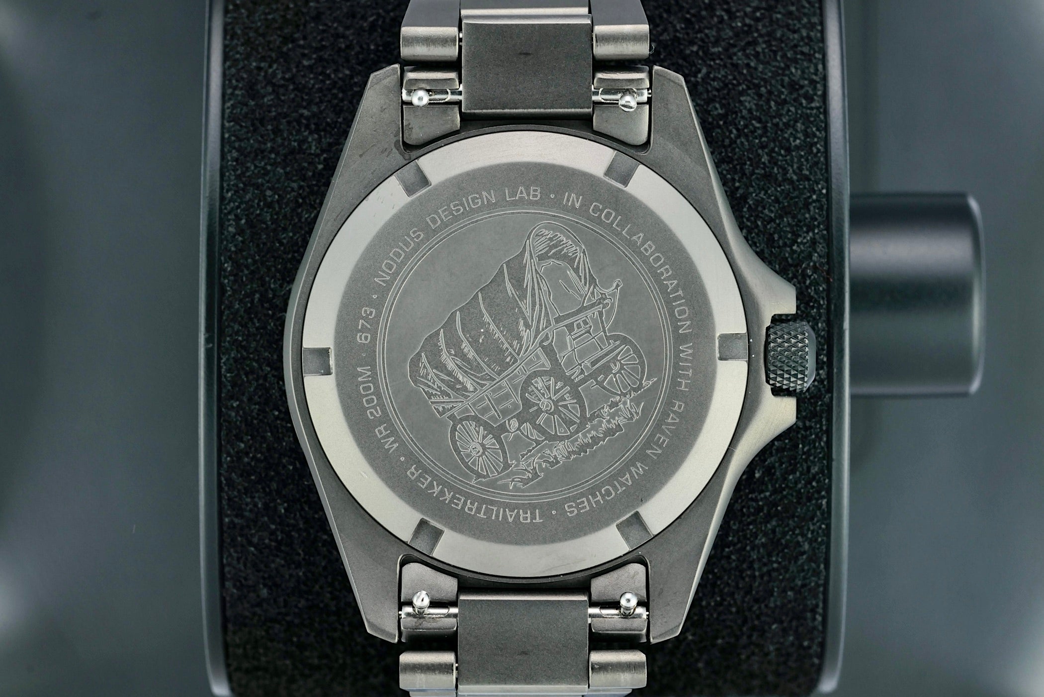 The Nodus X Raven TrailTrekker features a 39.5mm stainless steel case treated with a grey DLC coating, a fixed 24-hour Cerakote bezel, and a sapphire crystal, with artwork depicting a wagon in relief on the case back. The dial is also coated with Cerakote in a dark olive green color, with applied lumed hour markers, the Nodus logo beneath the 12 o’clock position, the Raven logo above the 6 o’clock position, lumed hands with a yellow GMT hand, and a date window at the 6 o’clock position. Powered by the Miyota 9075 automatic movement, the TrailTrekker has a 42-hour power reserve and a water resistance rating of 200 meters.