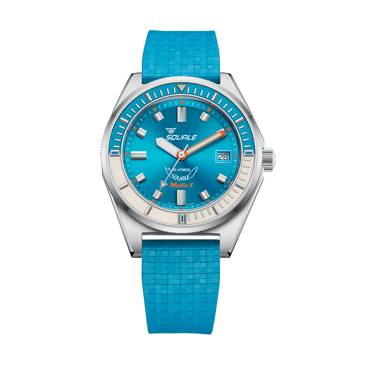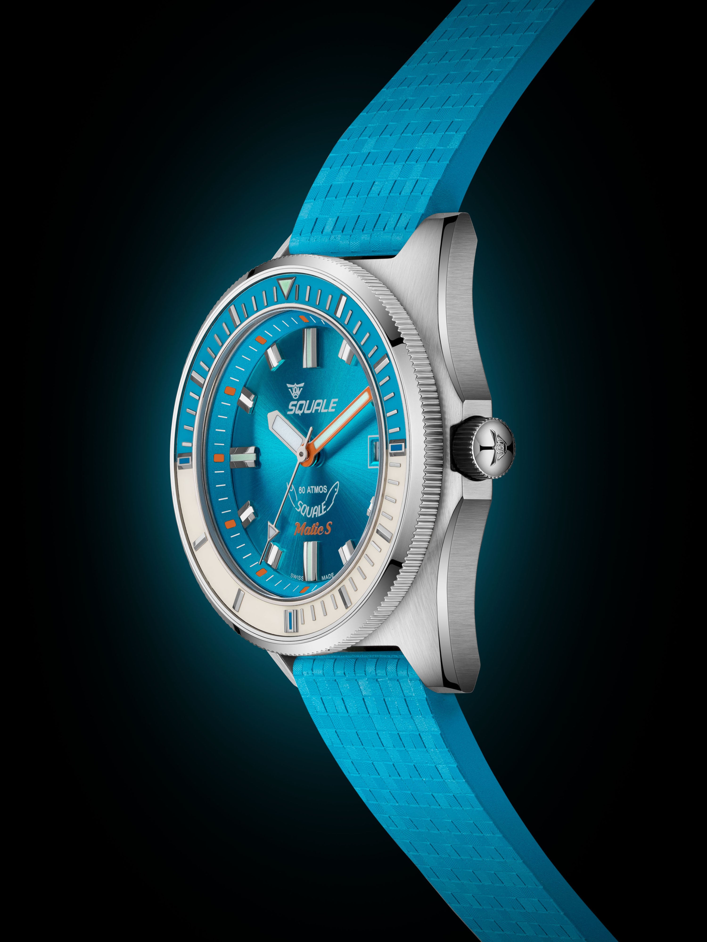 The Squale Matic S Light Blue Mosaic Rubber Watch is a refined reinterpretation of a classic dive watch — pairing professional-grade diving specs with everyday wearability. Its sunray light-blue dial shimmers with oceanic depth, accented by applied hour markers, subtle orange highlights on the inner rehaut, and hands and indices filled with Super-Luminova for excellent low-light visibility. The watch comes mounted on a light-blue Tropic-style rubber strap with a distinctive mosaic texture — a bold yet elegant choice that complements the timepiece's sporty dive origins while remaining versatile for everyday wear. With its mix of heritage, precision Swiss movement, and modern proportions, this Matic S stands out as a watch equally at home underwater or on land.