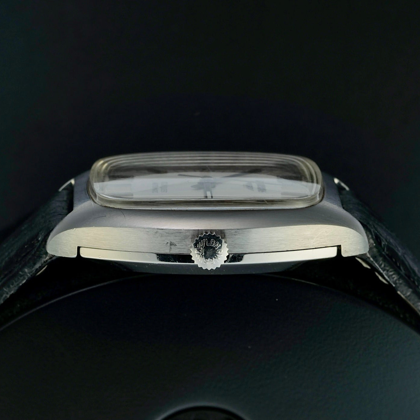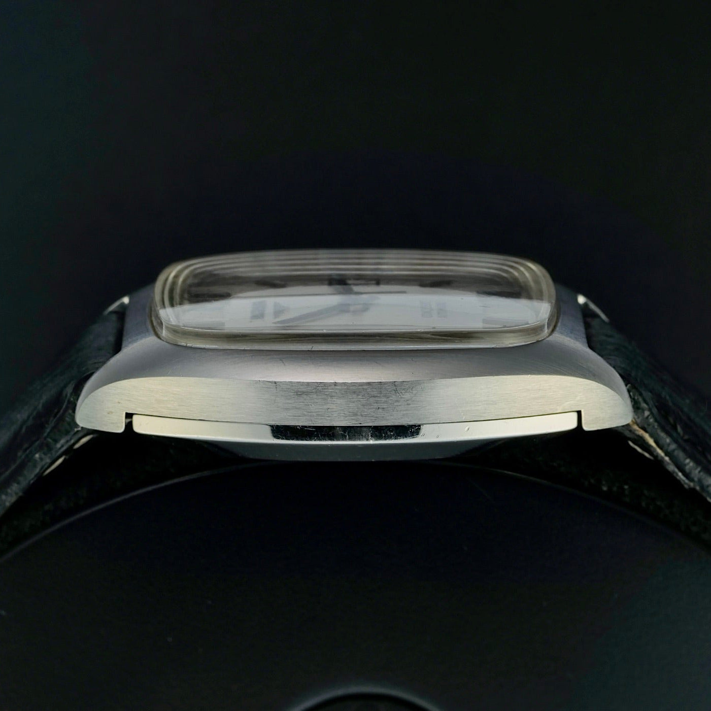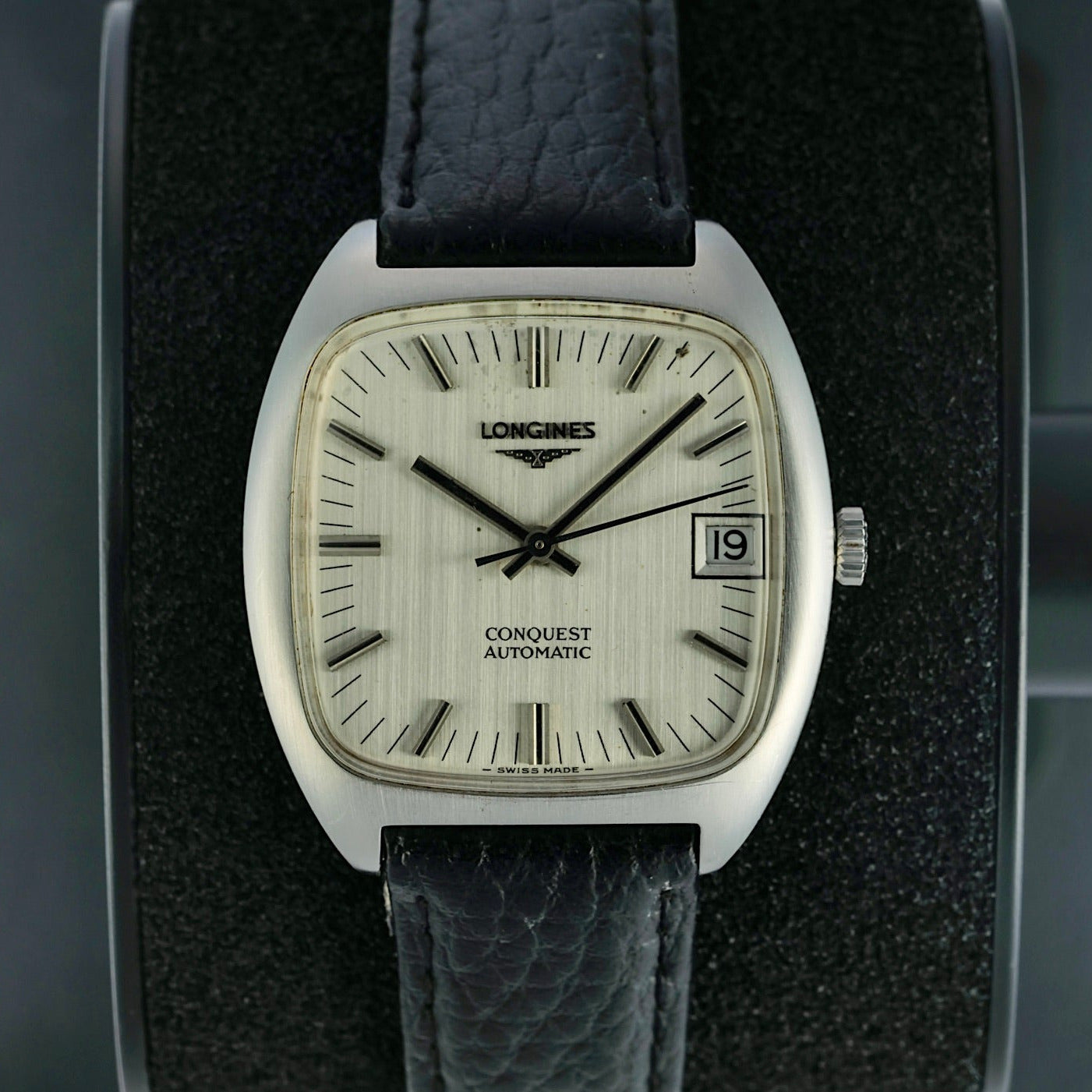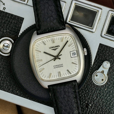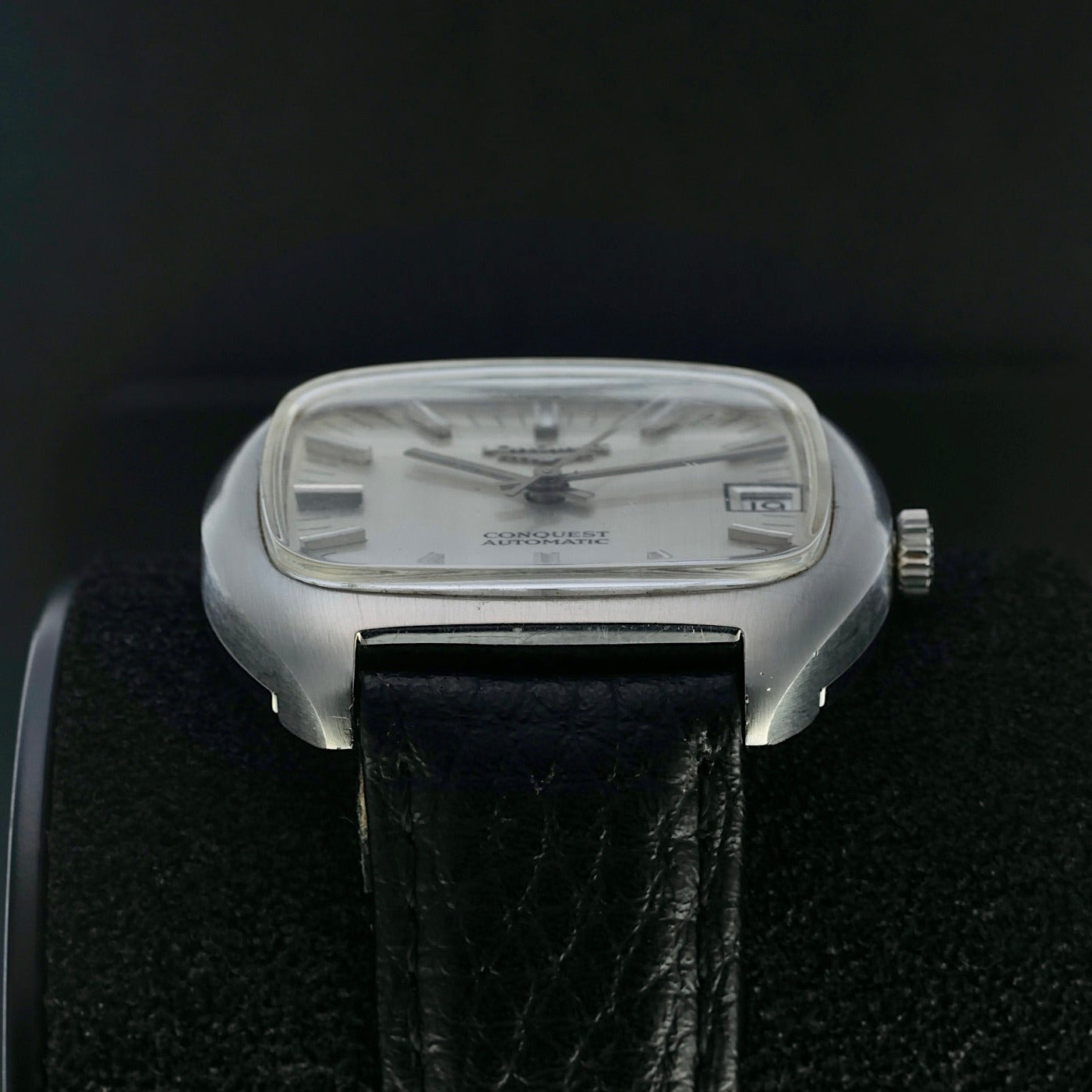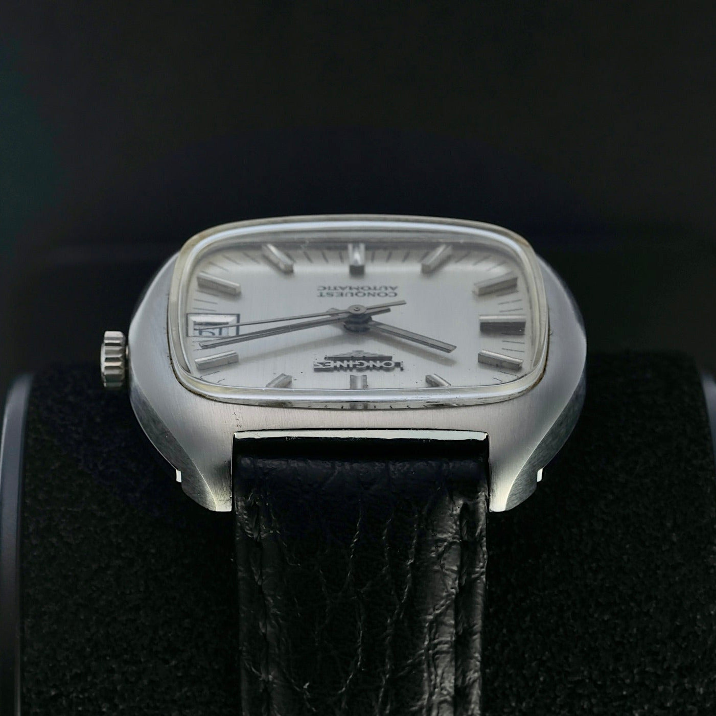 The Longines Conquest Automatic TV Dial Ref. 1026 is a striking vintage wristwatch from the late 1960s / early 1970s that blends sportiness with elegant design. Characterized by its distinctive “TV-shaped” case, the Conquest has a bold yet refined profile and is powered by the highly regarded Caliber 431 high-beat automatic movement. Today, the Ref. 1026 is appreciated by collectors for its unique case shape, classic Conquest heritage, and timeless style that bridges dress and everyday wear.